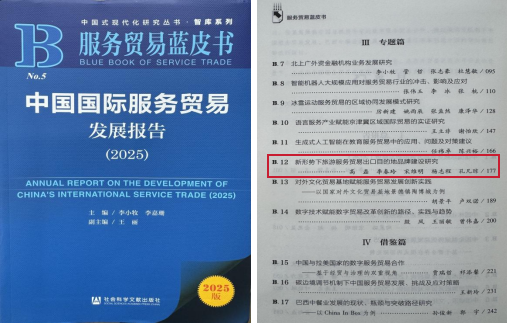 旅游管理系教师高磊牵头完成的智库成果《新形势下旅游服务贸易出口目的地品牌建设研究》成功入选国家出版基金项目资助出版的《中国国际服务贸易发展报告(2025)》,成为该国家级权威报告中旅游服务贸易领域的核心学术支撑内容,充分彰显了我校在文旅智库研究领域的专业实力与行业影响力。